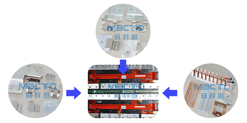 铜铝复合排有铜铝复合材料经冲压一体成型或铜、铝材料单独冲压成型后经超声焊接而成。主要应用于动力电池模组的正负极输出连接