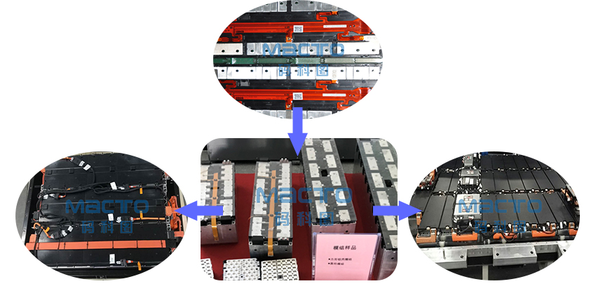 电池模组化设计提高了产品标准化,极大提升了生产效率和降低维修成本。模组集成件就是把电芯连接件,正负极铜铝输出排,信号采集和温升采集线组装在一起,通过激光焊接成为一个组件,然后和一组电芯激光焊接变成一个标准模组。几个模组合成一个电池箱体。